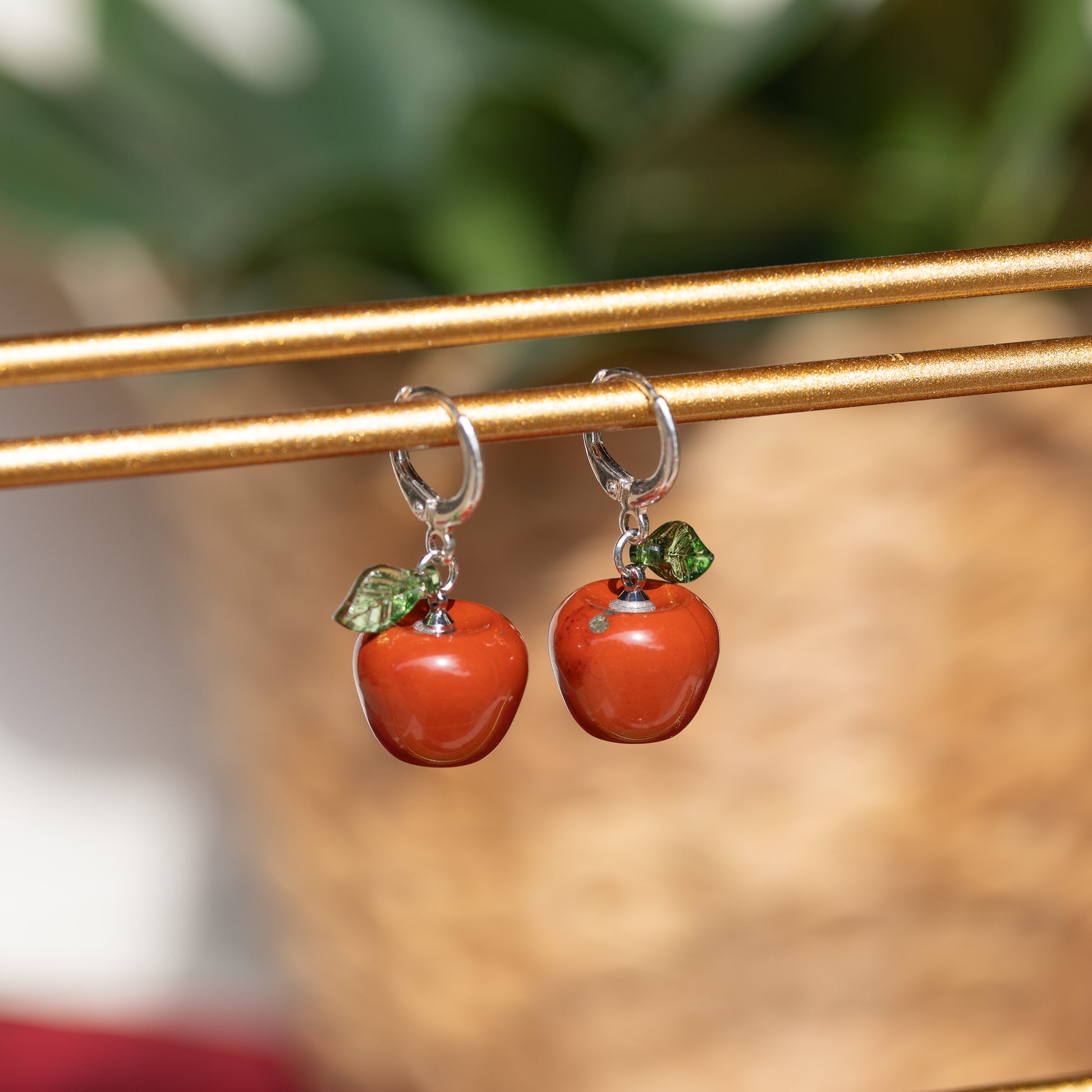Description: The Apple Huggie Earrings feature two red jasper stones accented by green acrylic leaves, resulting in a striking resemblance to the actual fruit. Lightweight and hypoallergenic, these quirky earrings are perfect for apple lovers, teachers, and fall festivities!