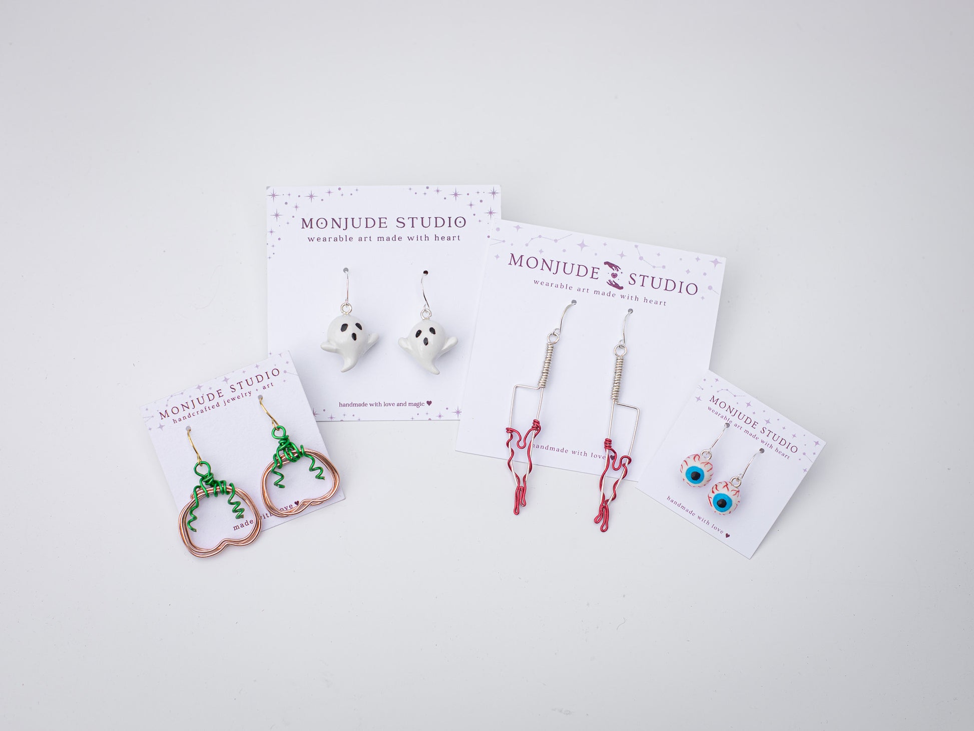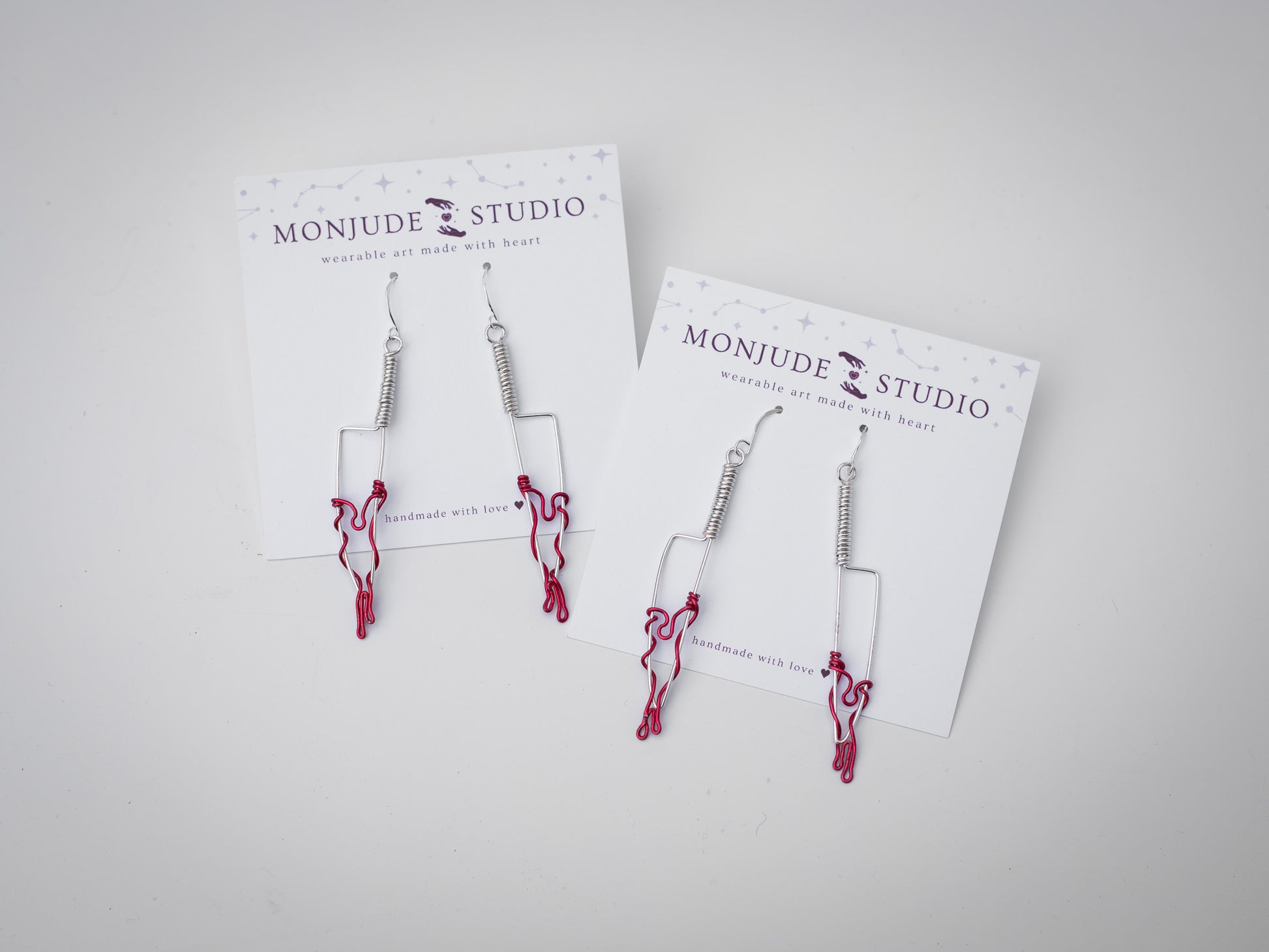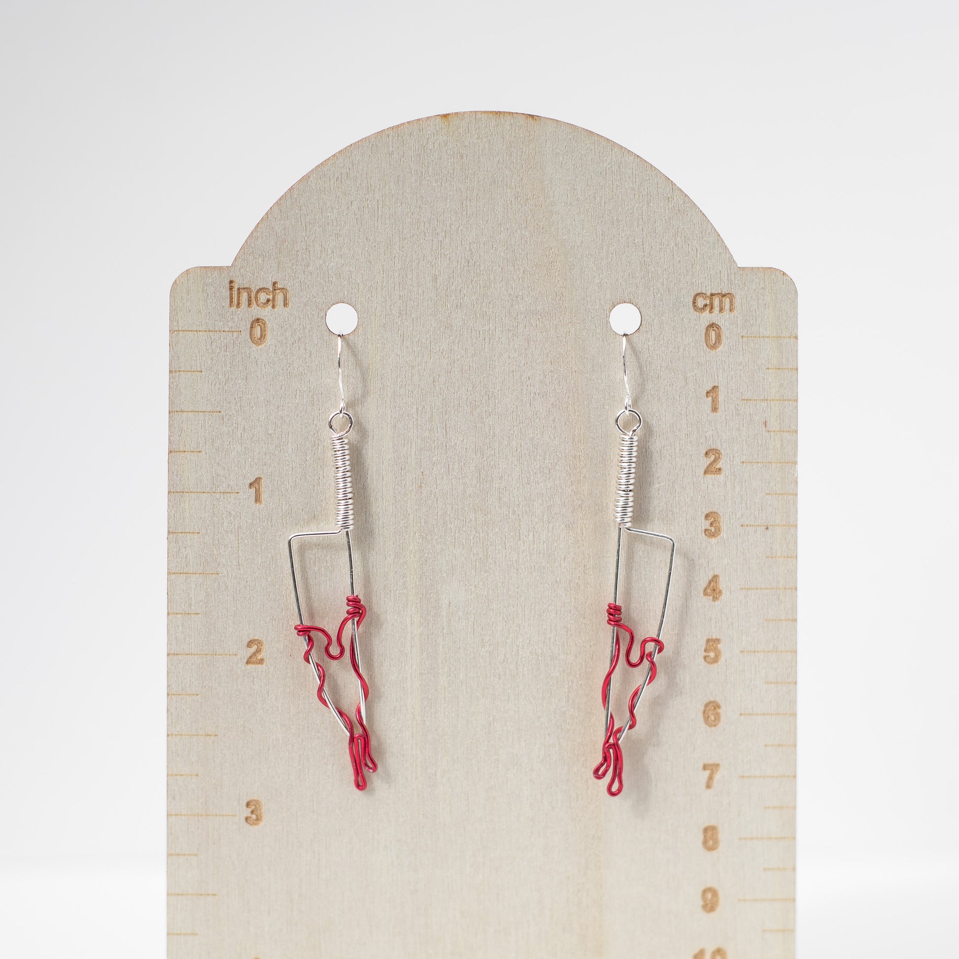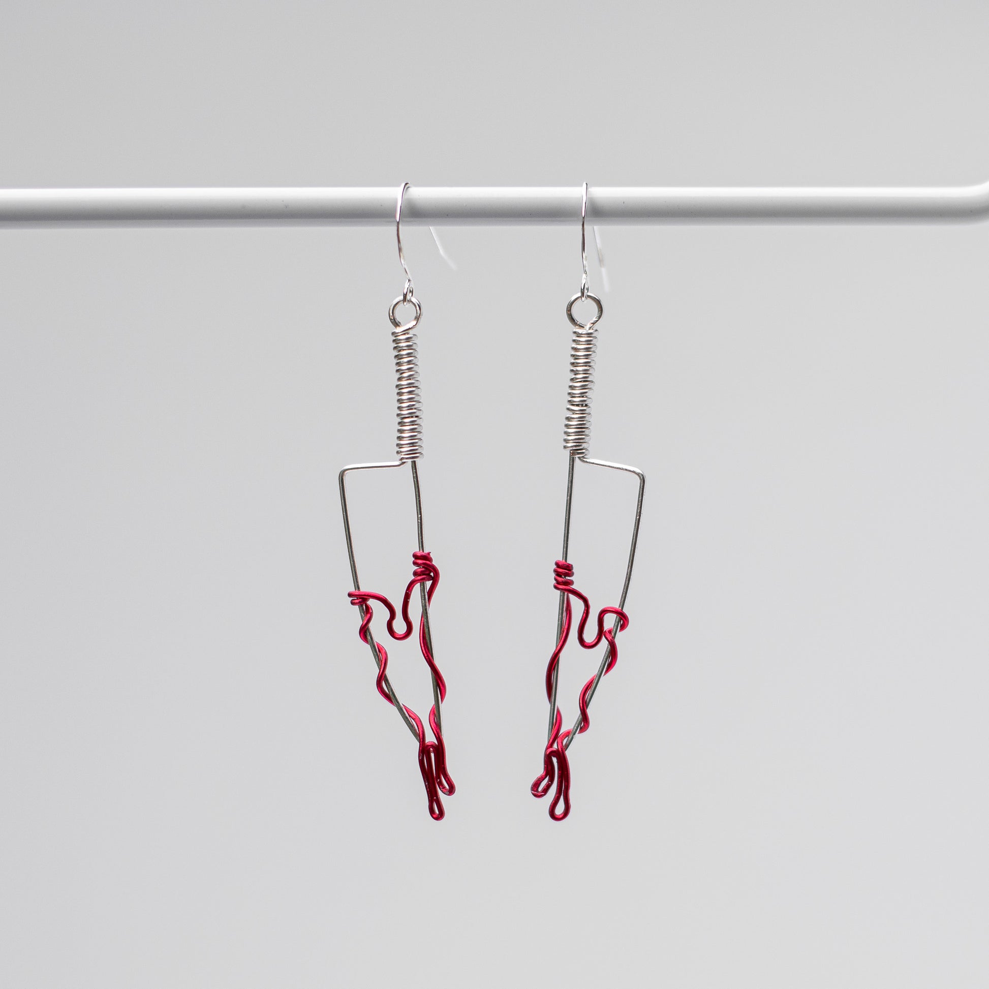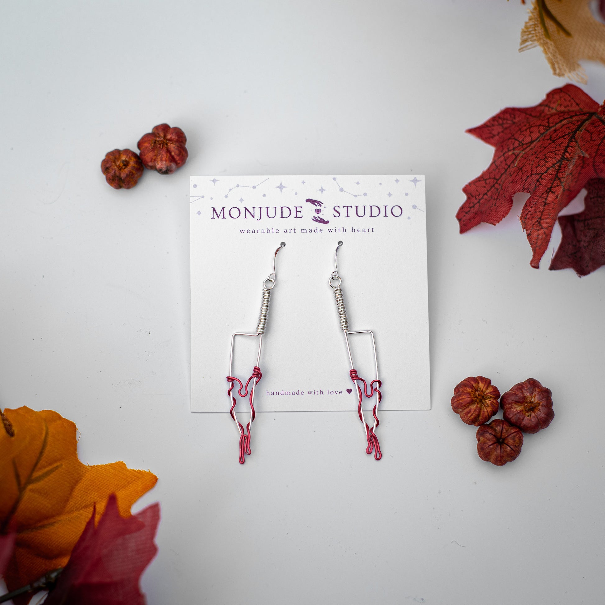 Description: Miniature knife earrings with dripping blood details, all made from wire.
