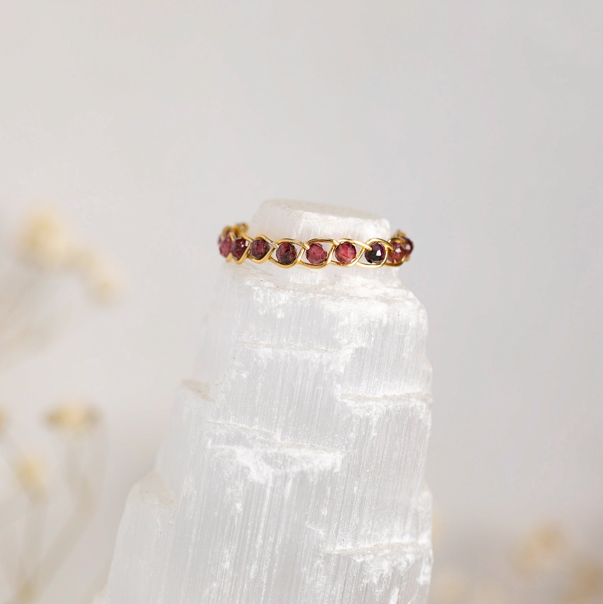 Description: Unique, dainty, and elegant this ring features a braided row of dainty garnet stones to help raise the vibration of your ring stack! This ring makes a great birthday gift for any January babies or for that special someone.