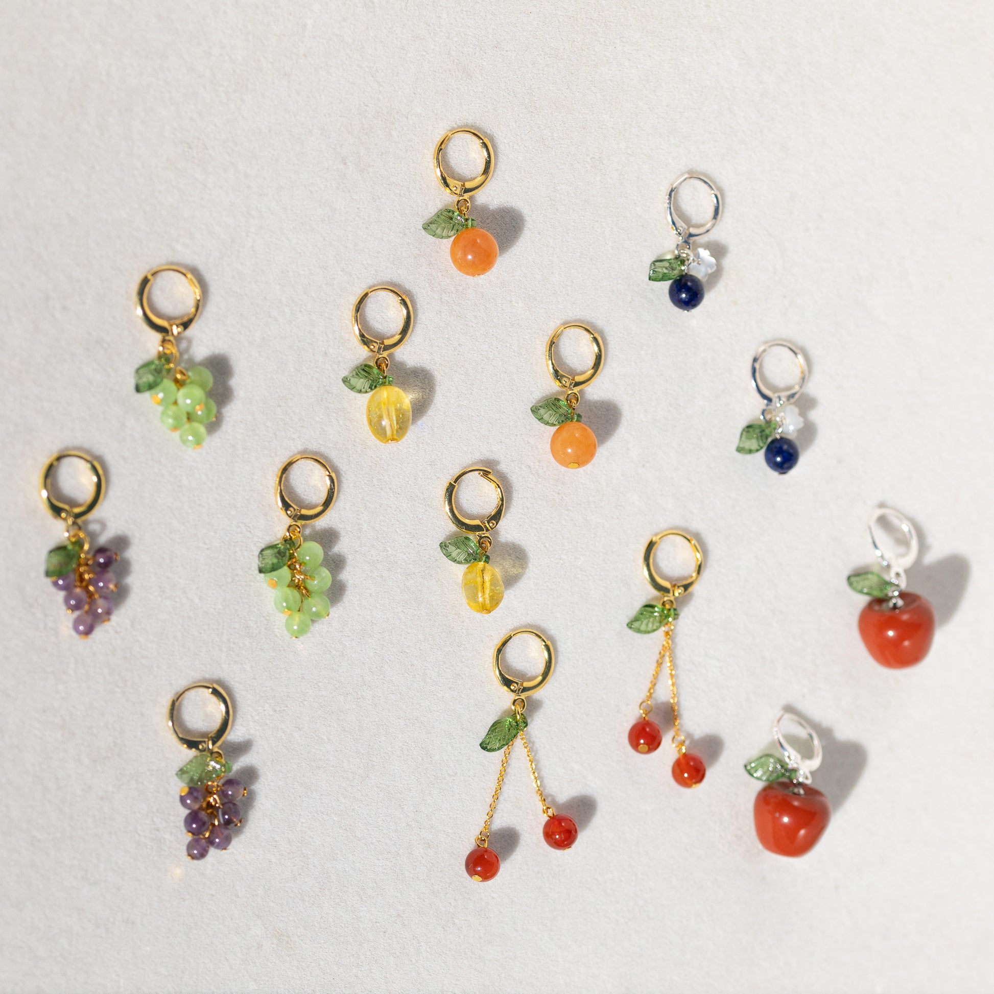 Description: These Cherry Huggie Earrings feature two vibrant carnelian stones and a green leaf dangling from each huggie. Lightweight and hypoallergenic, these fruity earrings add a fun and unique touch to any accessory collection.