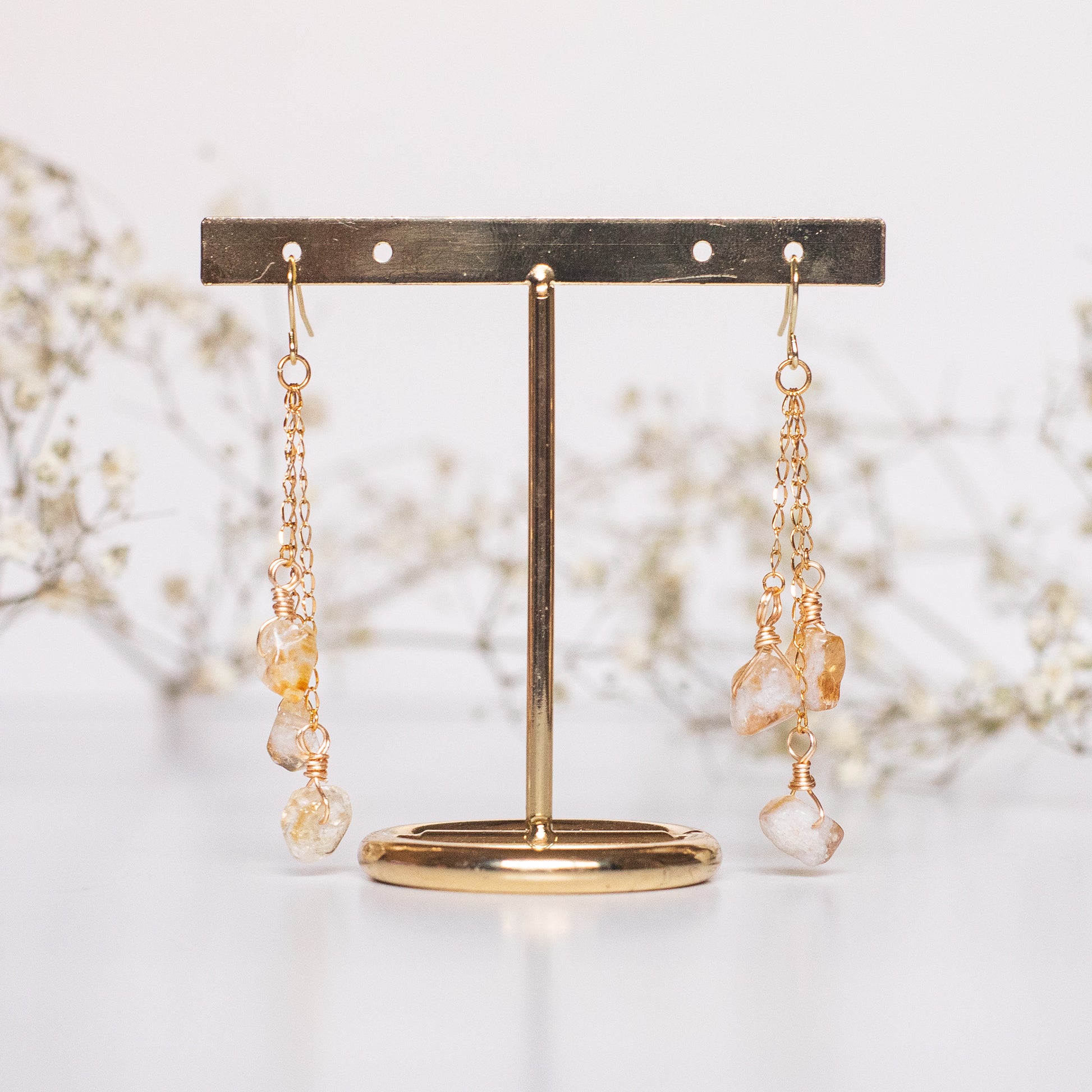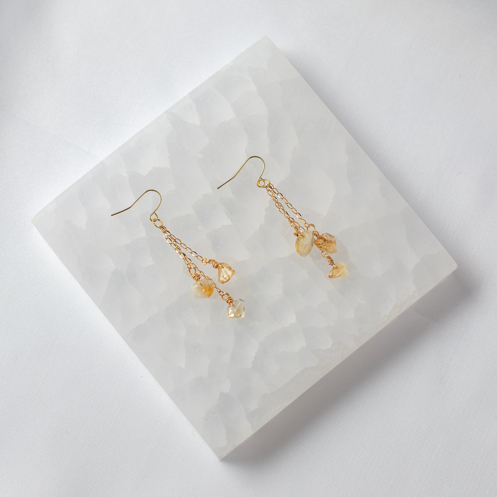 Materials: Handcrafted out of citrine quartz crystals, silver coated wire, gold plated chains, and hypoallergenic silver plated earring hooks. Secured with rubber earring backs.