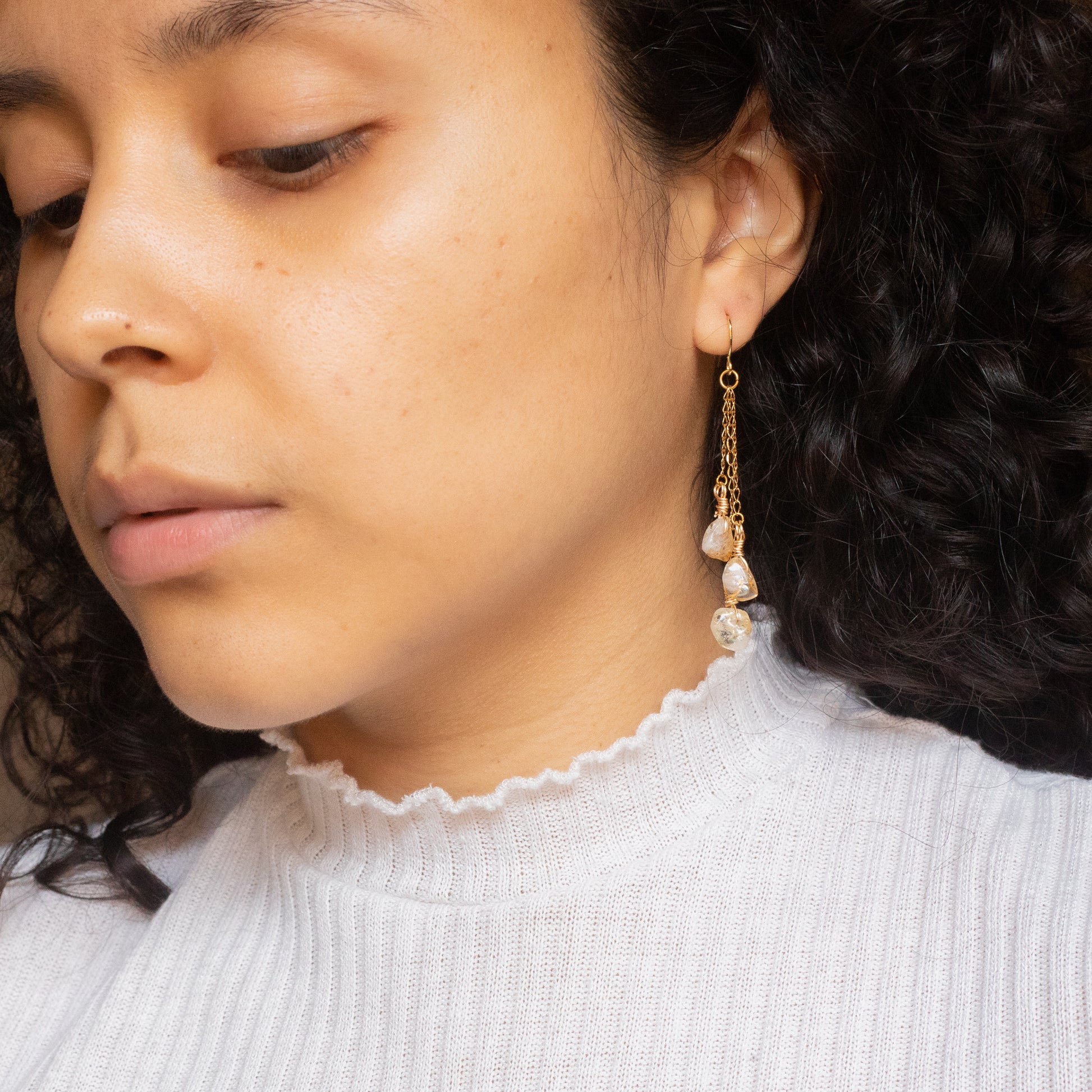 Description: These delicate and elegant earrings each feature three wire wrapped citrine crystal chips dangling on golden chains.