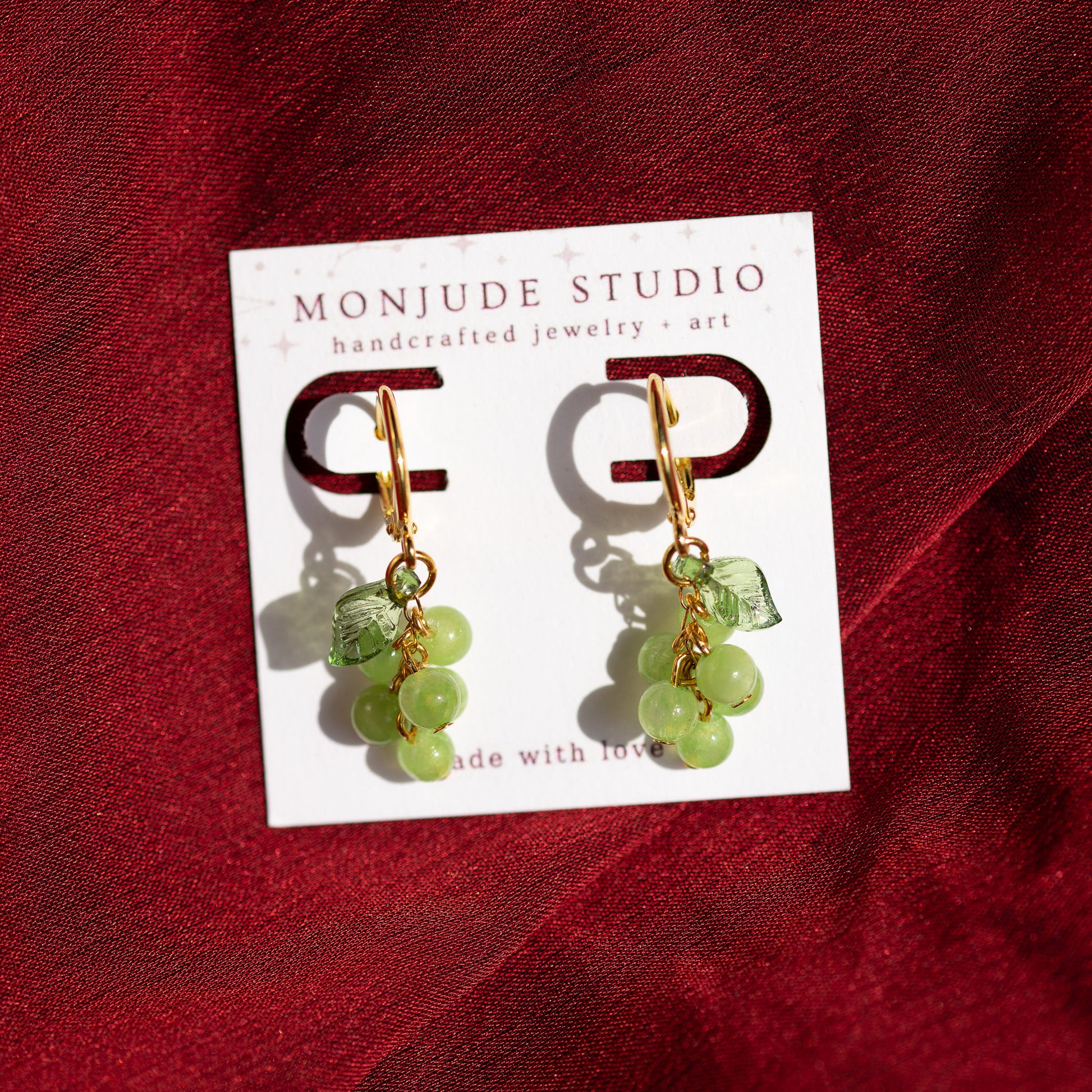 Description: These Grapes Huggie Earrings add a whimsical yet elegant touch to any look. These earrings combine a dozen hand-selected, genuine gemstone beads and green leaf accents to create two miniature bundles of grapes that dangle from your ears. They're lightweight and hypoallergenic, making them perfect for both everyday wear and special occasion!