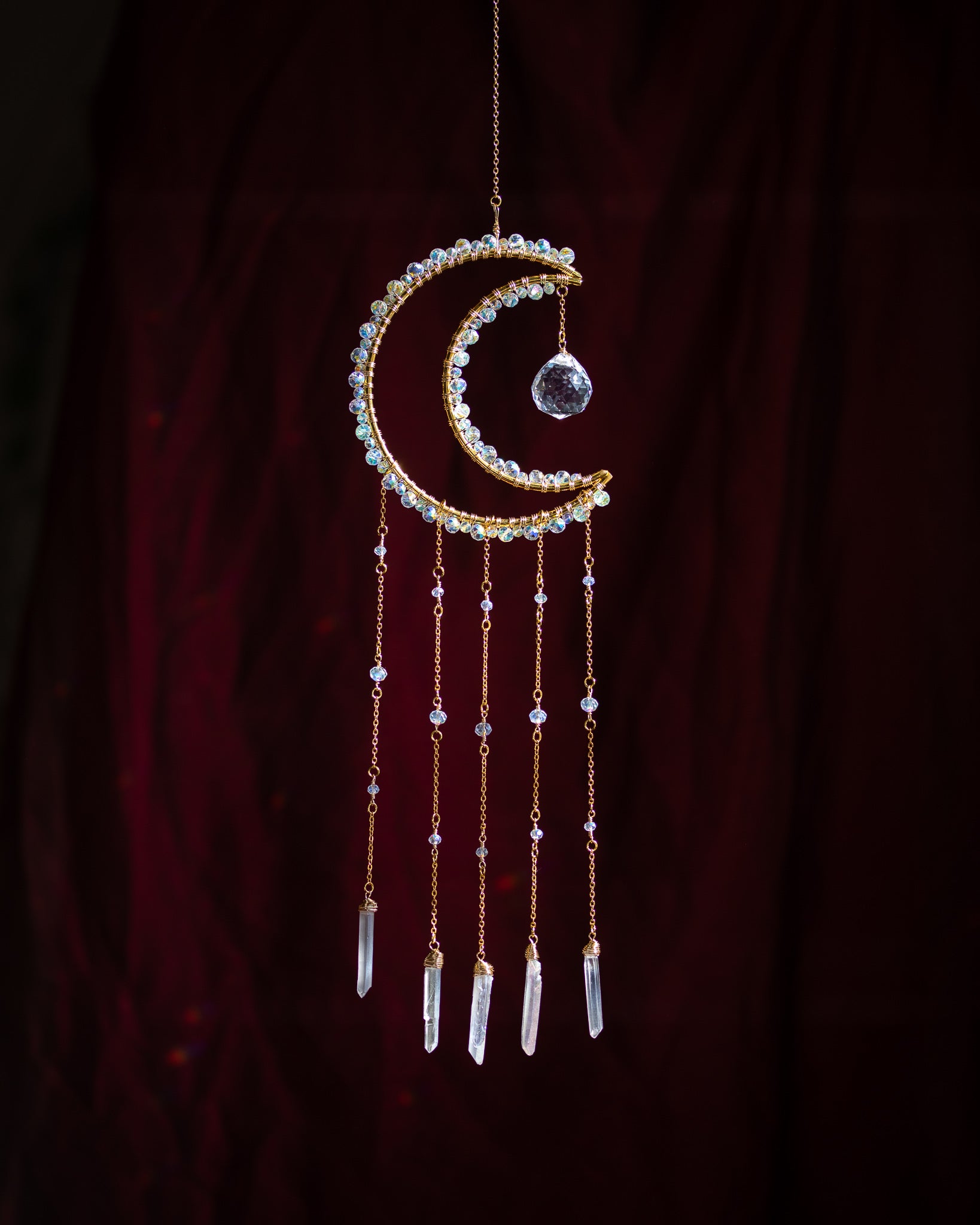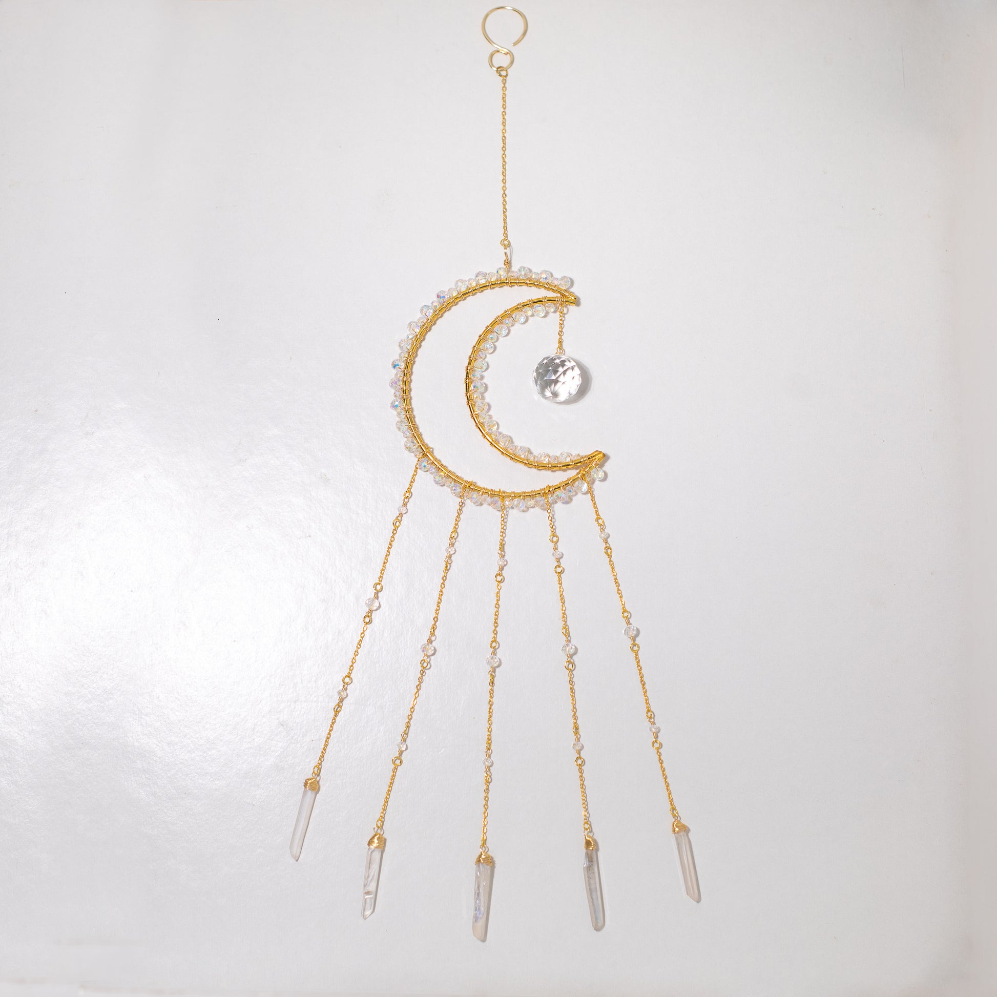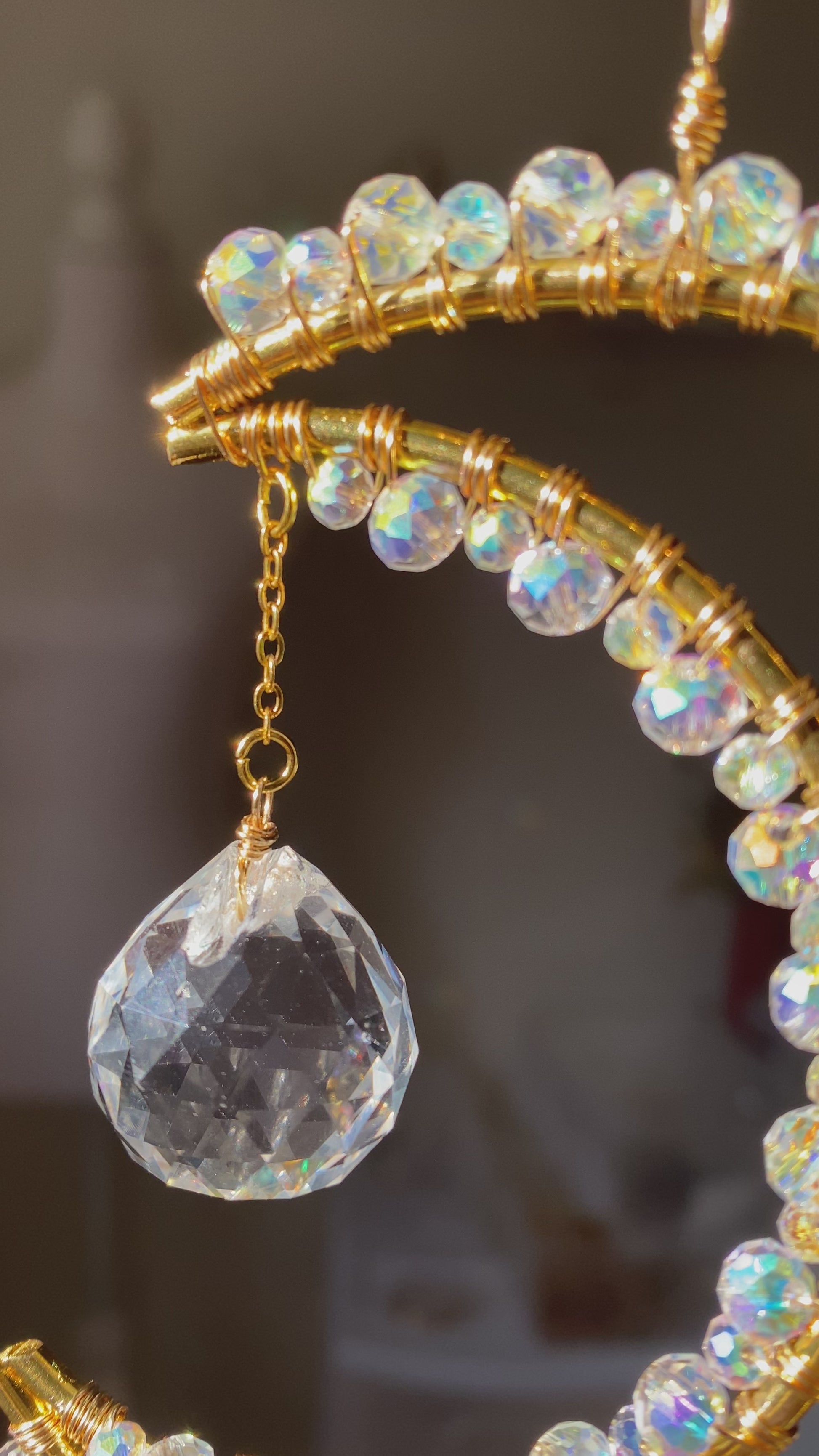 Description: Created to add a touch of whimsical beauty to your every day, this one of a kind suncatcher will brighten any room and fill it with countless tiny rainbows! Embellished with over one hundred crystal prism beads hand woven and dangling from a golden moon, this piece features a mixture of glass and natural quartz stones that are sure to brighten your space and spirit.