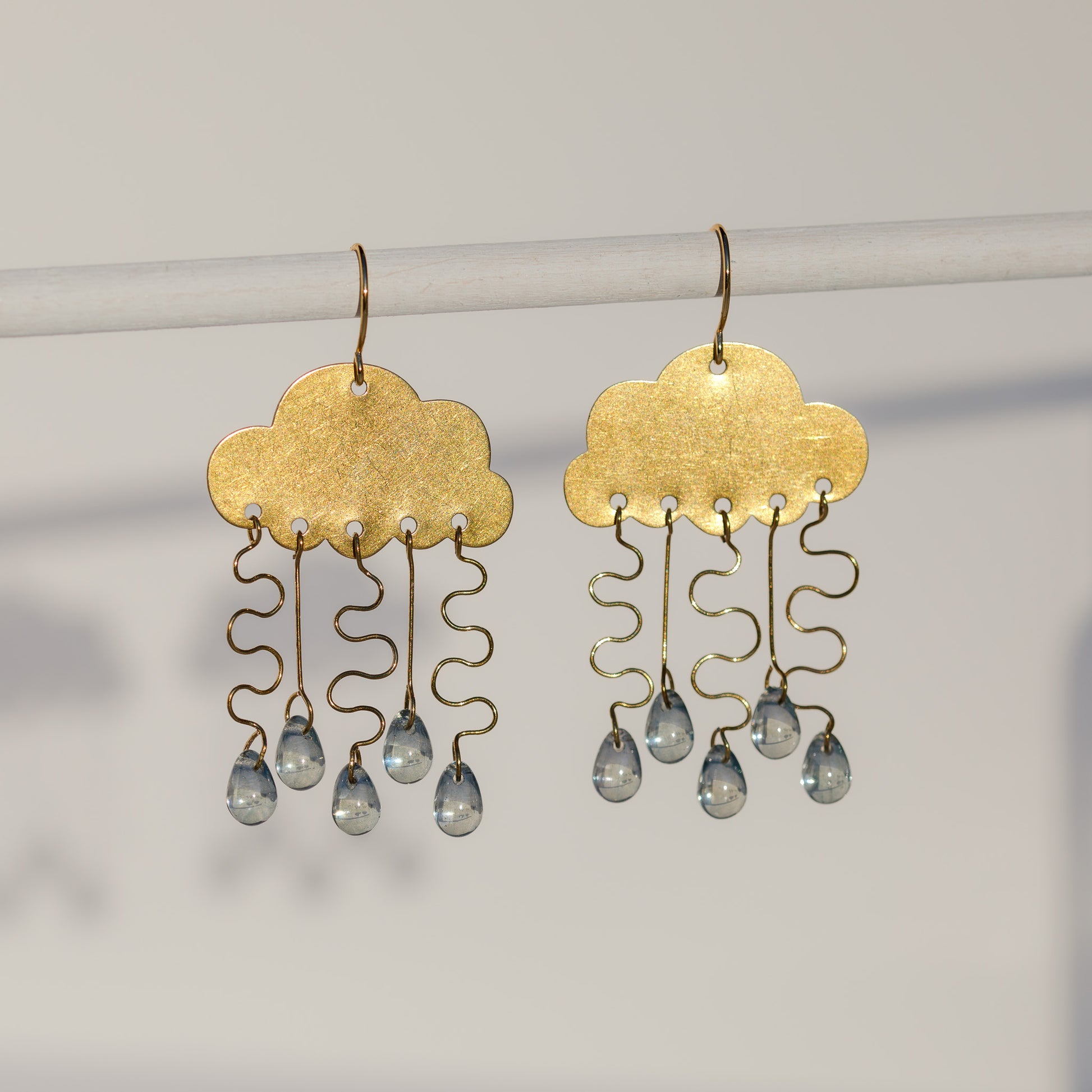 Description: Made in appreciation of the wild and free flowing beauty of every storm, the one of a kind Rain Clouds earrings depict a total of ten Czech glass drops raining down from two brass clouds. Each earring features delicate wire accents and 14k gold plated earring hooks.