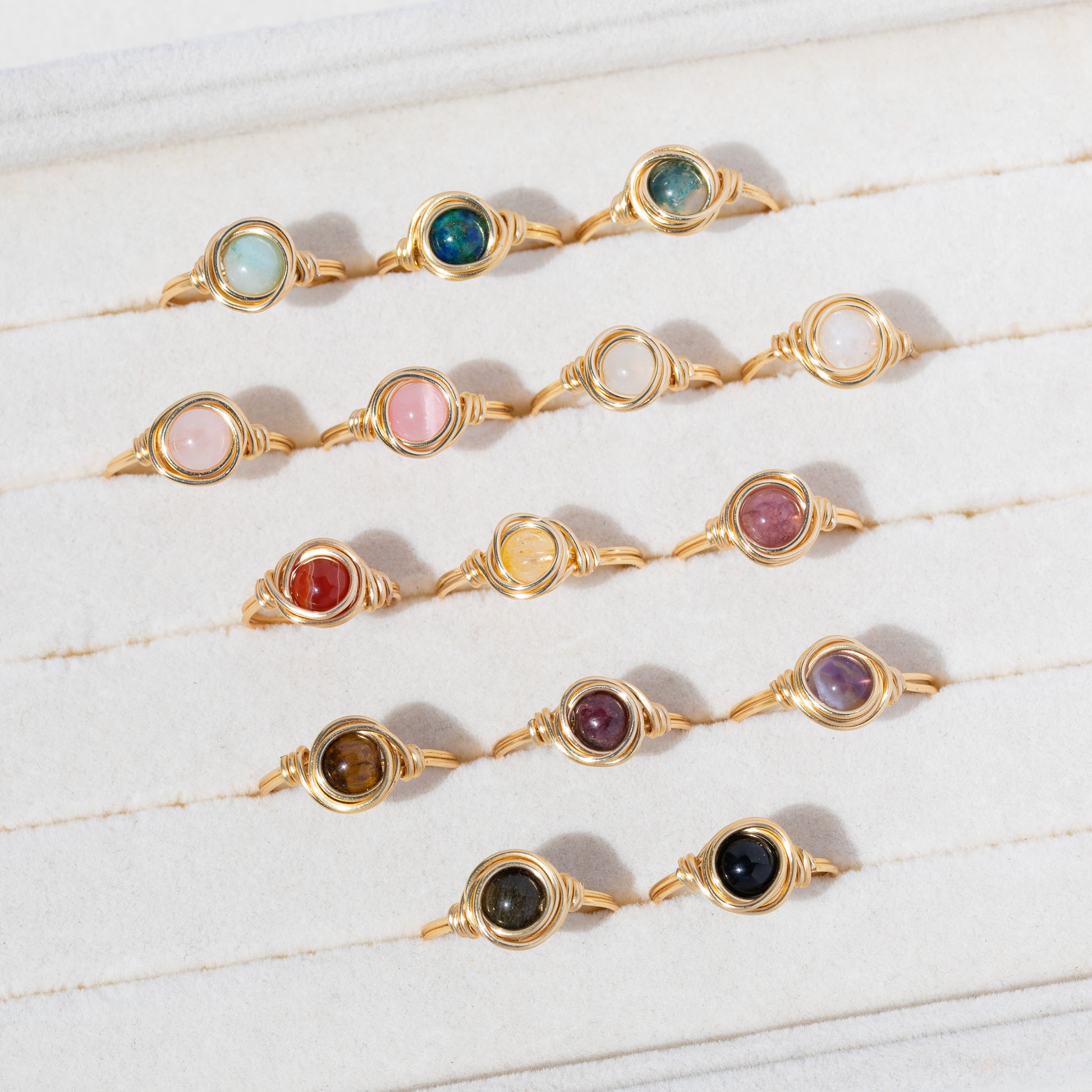 Description: This customizable wire wrapped ring features a genuine gemstone of your choice at its center so you can always carry its energy with you! The simple thin golden wire band wraps around the crystal to bring attention to its gorgeous natural beauty.