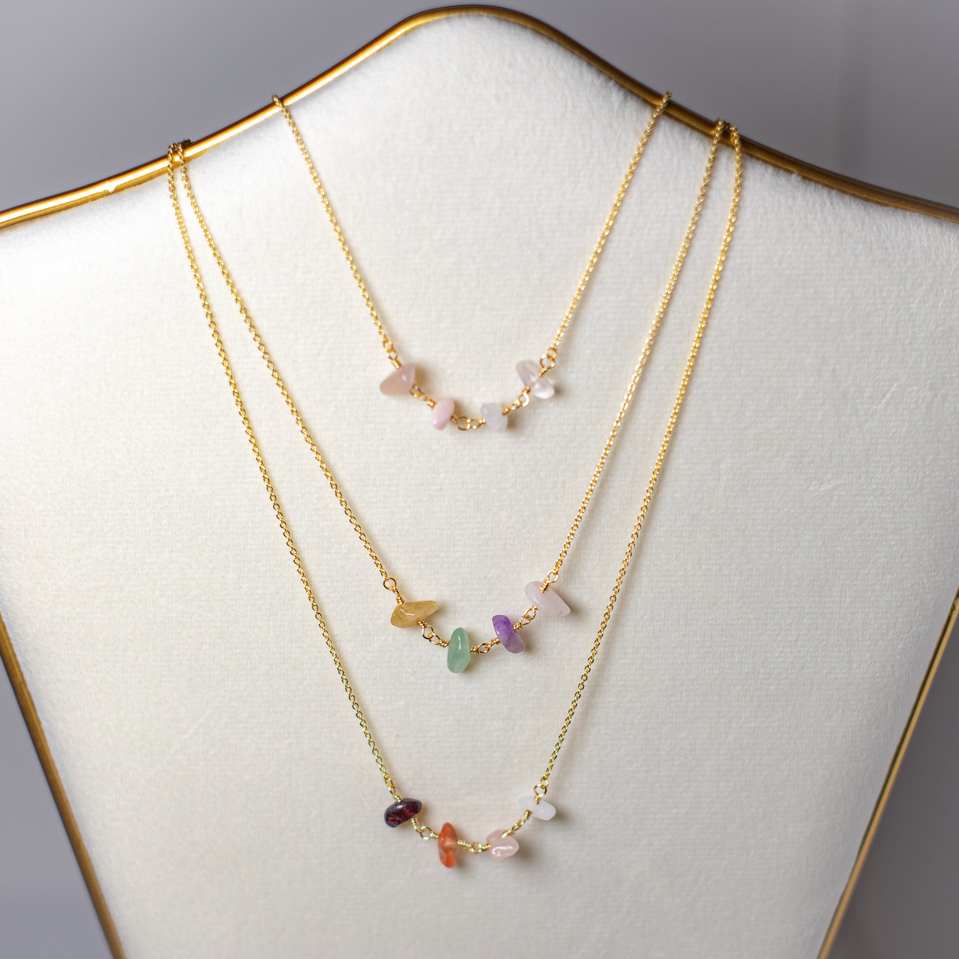 Description: This ready-made version of our Custom Freeform Birthstone Necklace features pre-selected birthstone combinations chosen for their beautiful color harmony. Perfect for anyone who loves the look of our customizable piece but prefers a ready-to-ship option. Each necklace includes four curated freeform birthstones chosen for their beautiful colors, creating a timeless piece that makes a wonderful gift for mothers, loved ones, or yourself.