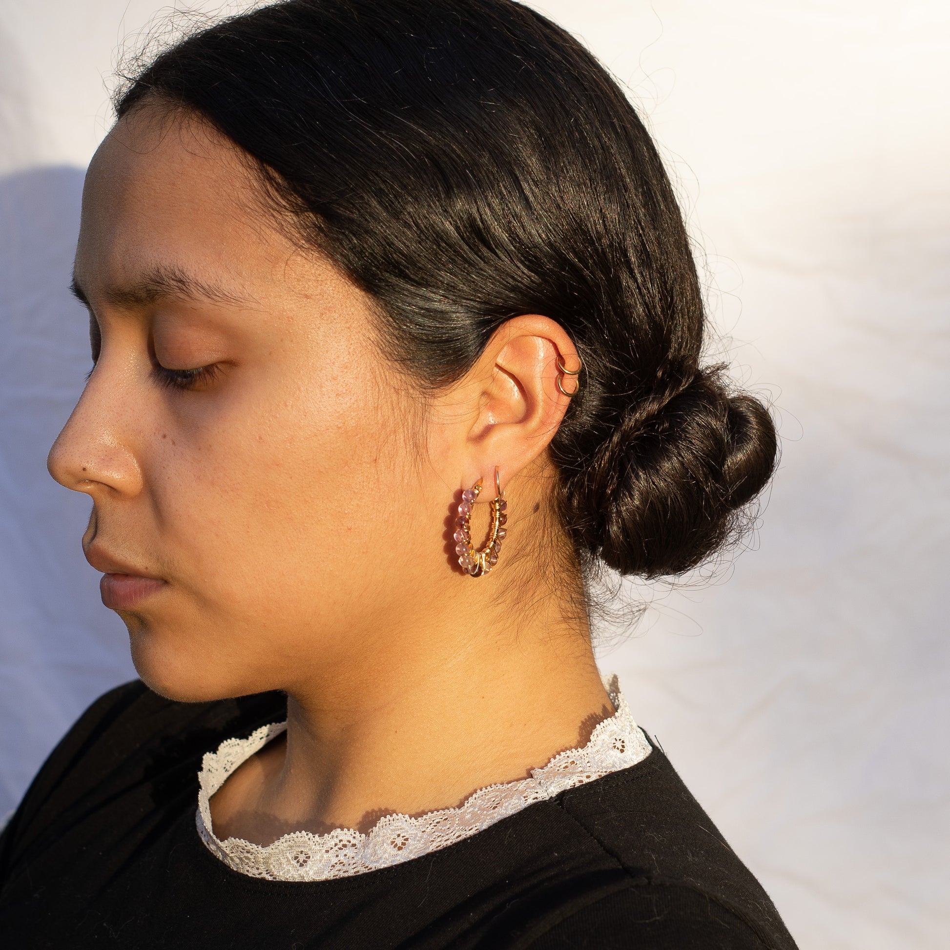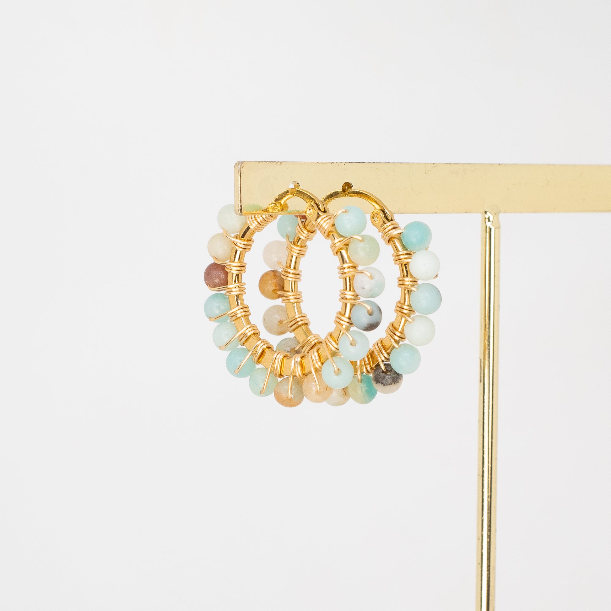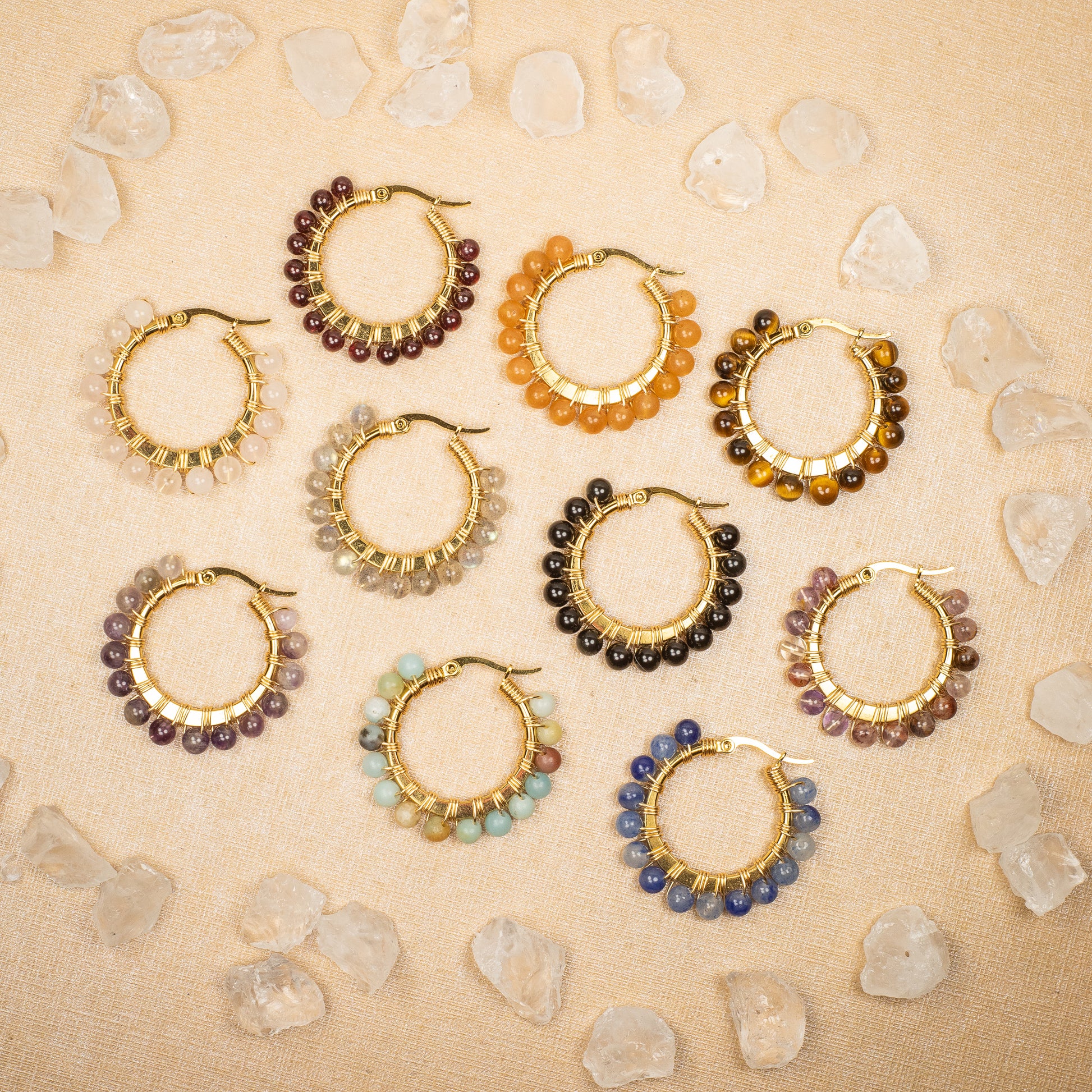 Description: The Wire Wrapped Crystal Hoop earrings feature dozens of gemstones wrapped onto the golden hoop design. Each stone is carefully selected for its unique beauty and energetic properties, bringing a touch of natural magic to this timeless and elegant design. Slowly crafted with care and intention, these earrings are made with genuine gemstones and hypoallergenic hoops, ensuring lasting wear and comfort. Whether you're drawn to their handcrafted beauty or their energetic properties, these Wire Wrapped Crystal Hoops are designed to elevate your energy in style.
